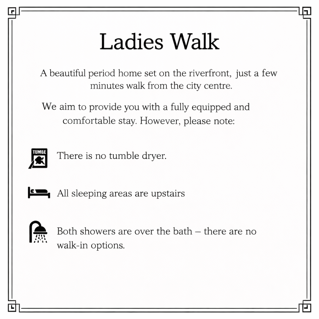 Ladies Walk is a grand spacious period house in a prime riverside spot near the City Centre. This home is full of original character and quirky charm , offering the option of a truly magical stay in the city.